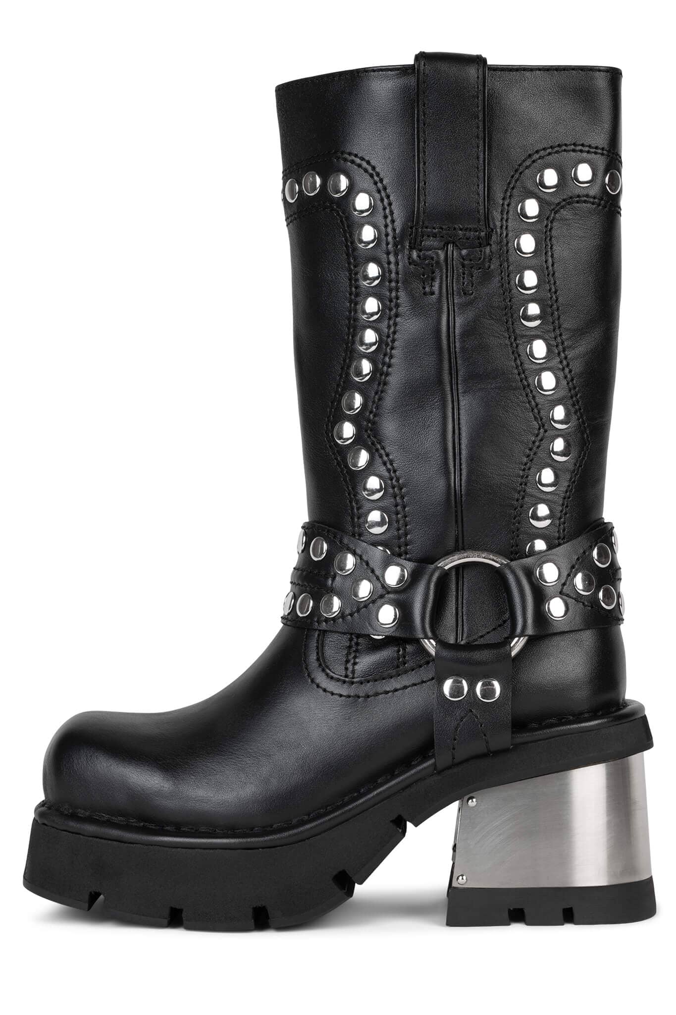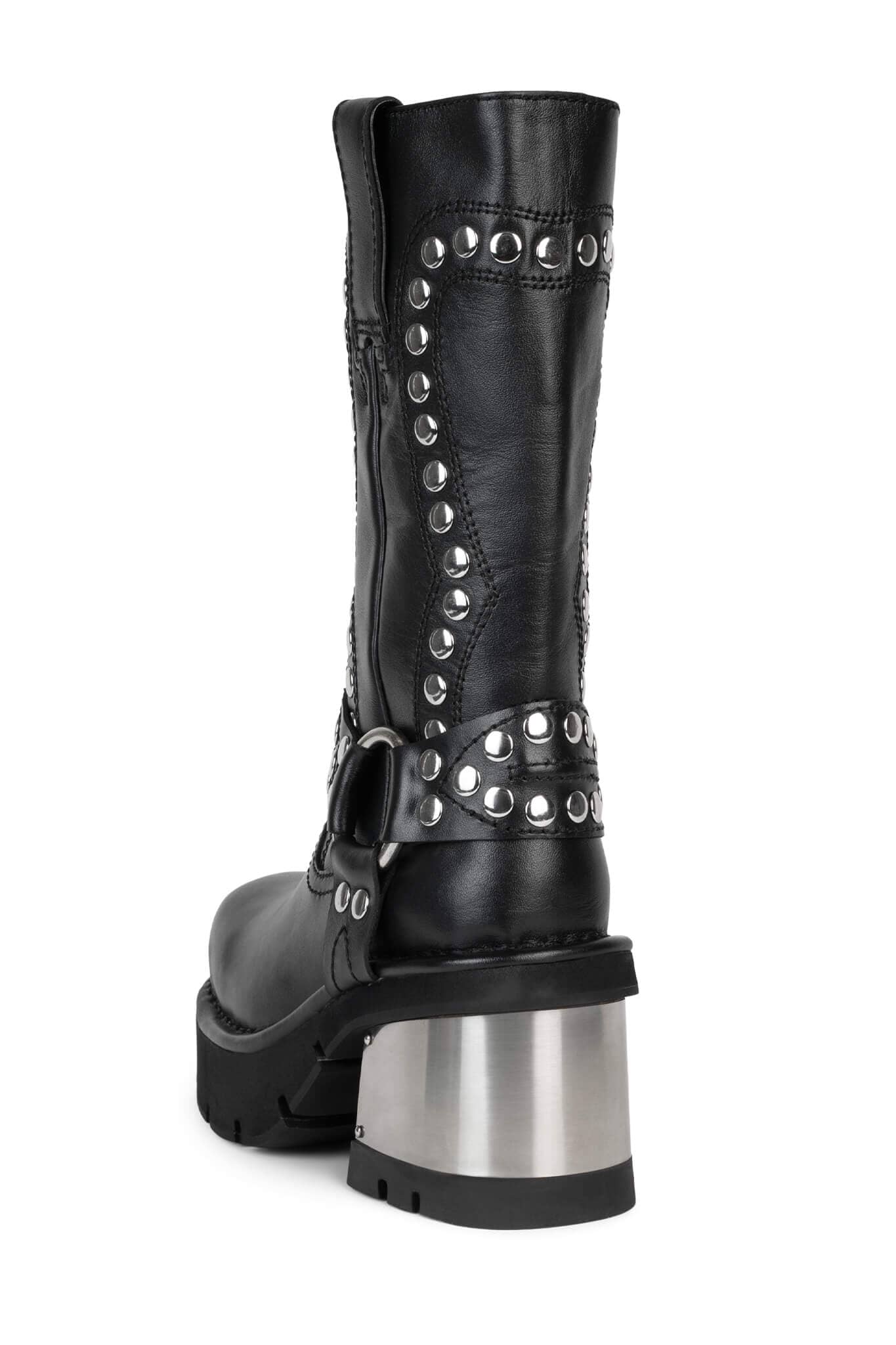 恰到好处的跟高设计,修饰腿部线条比例,铆钉装点靴筒帅酷有型,搭配金属跟充满力量感