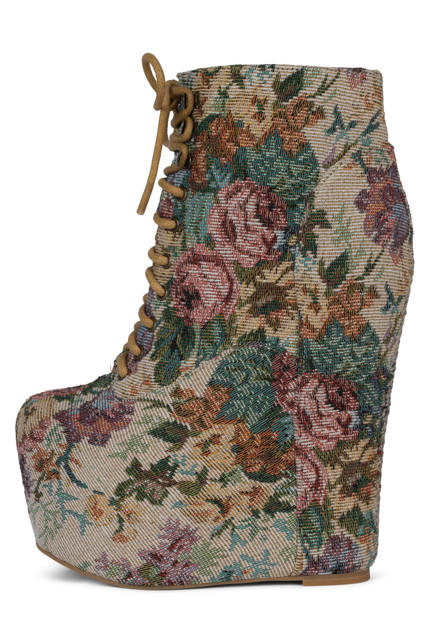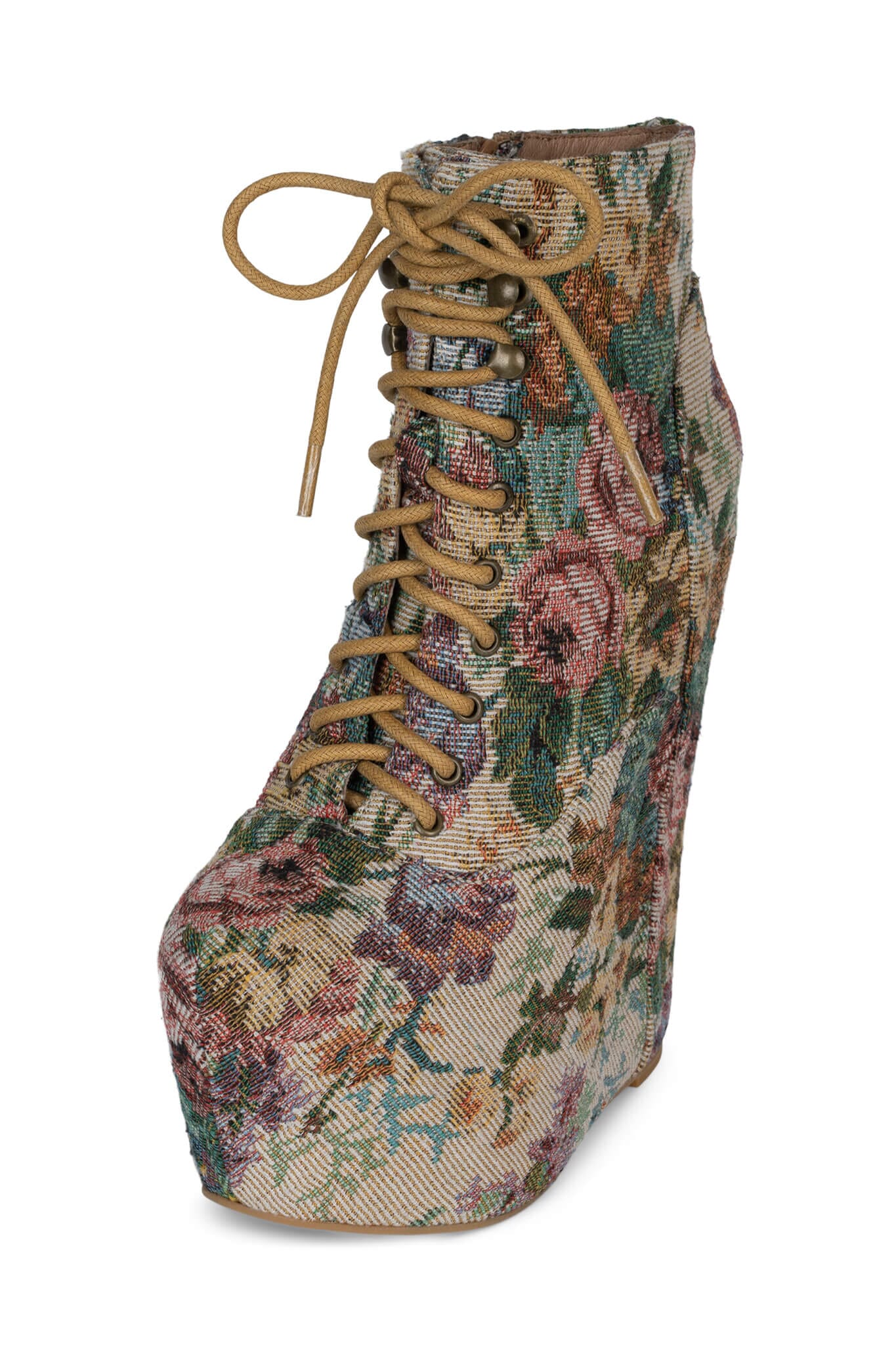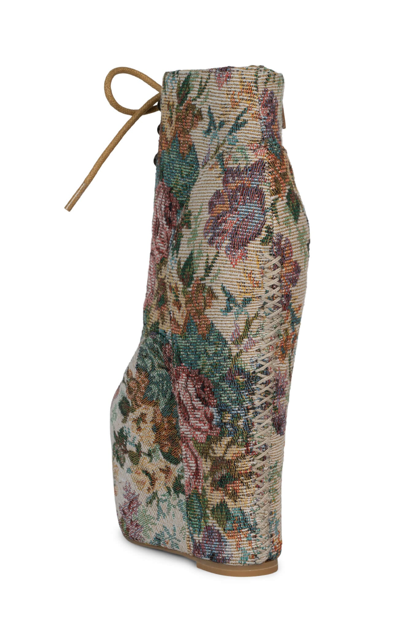 内藏水台坡跟设计,新颖又彰显无与伦比的艺术美感,花布系带的搭配,抢眼又吸睛