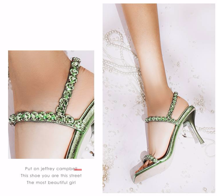 薄荷绿细跟水钻凉鞋