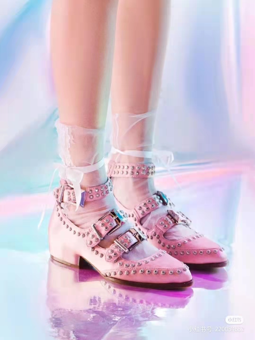 三条宽面饰带的装饰,隐约透出迷人脚背。