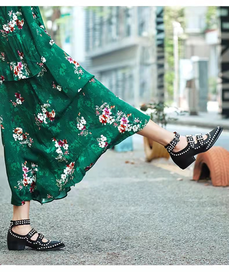 用铆钉代替华丽的材质在缎面鞋面上增加不羁个性。