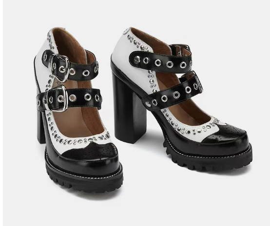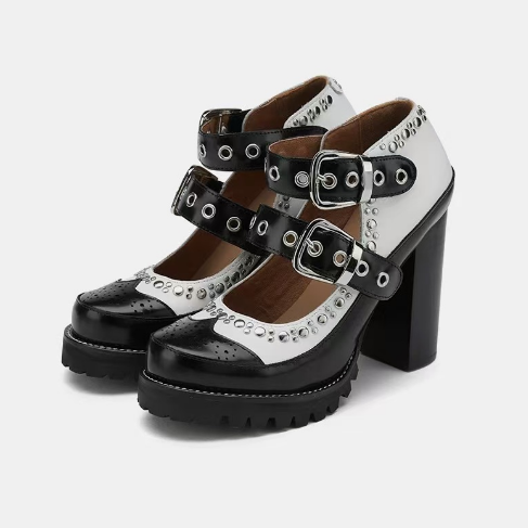 黑白拼色的设计经典而时尚,黑色的沉稳与白色的纯净相互碰撞,铆钉沿着侧边点缀,让脚背的曲线更加动人