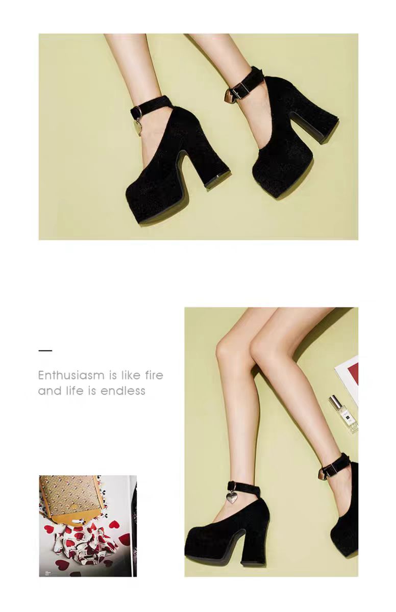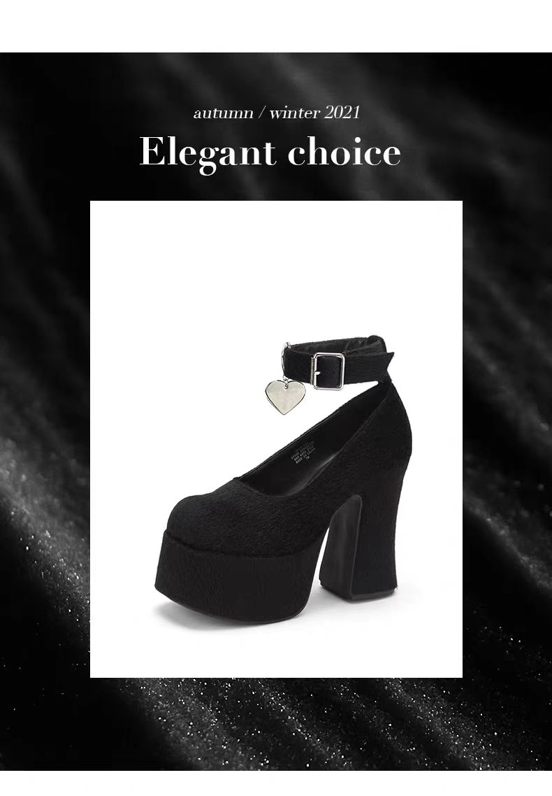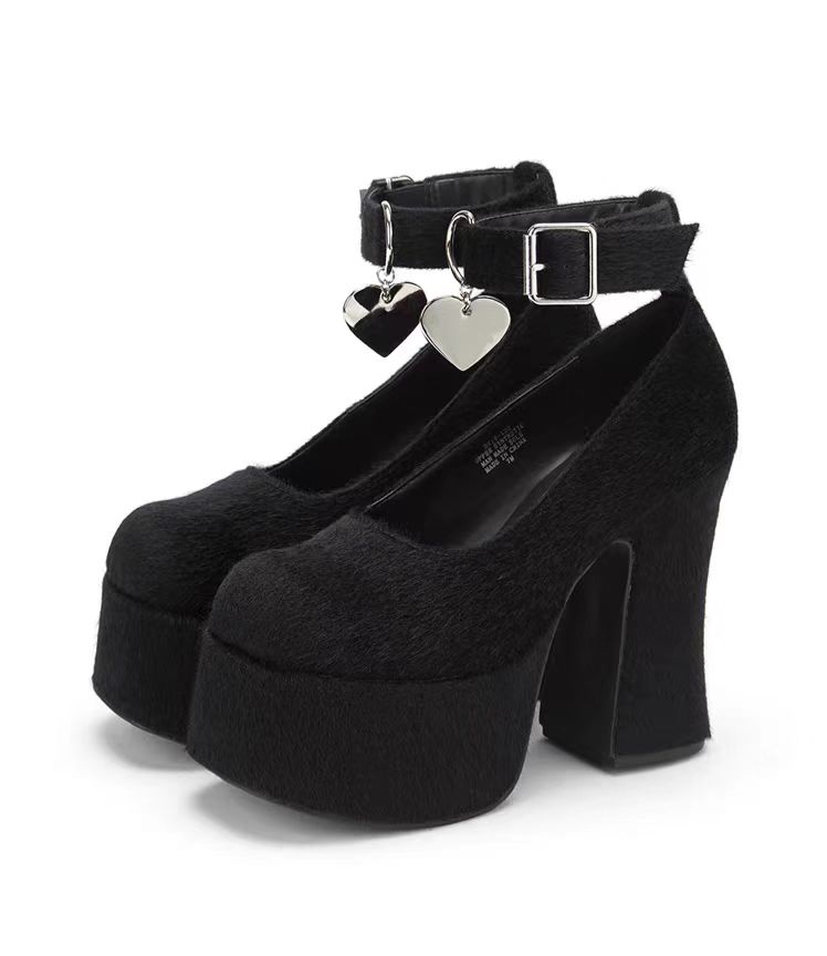 鞋的高防水台厚底与粗跟设计契合这一流行趋势。脚踝处带金属扣绑带及心形坠饰元素,增添时尚感与独特性,符合当下追求个性、精致的时尚潮流。