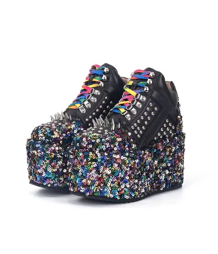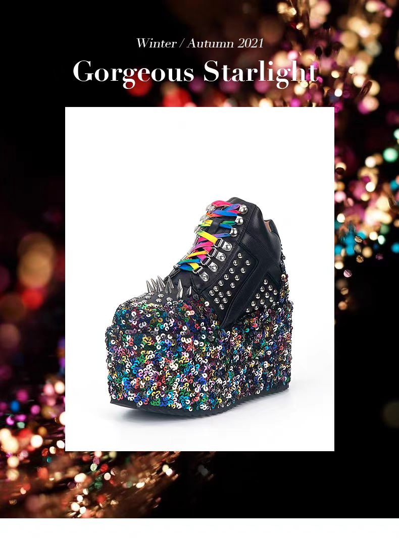 以大胆的亮片拼接设计夺人眼球。鞋面布满五彩斑斓的亮片,如同夜空中闪烁的繁星,极具视觉冲击力。厚底松糕设计,不仅显著增加身高,还拉长腿部线条,优化身材比例。厚底的高度恰到好处,既实现增高效果,又不影响行走舒适度 。