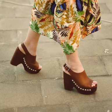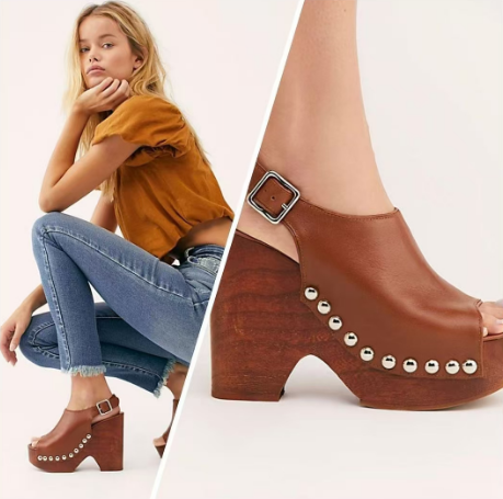再瞧瞧这双棕色的木履鞋,鞋面上排列整齐的铆钉,个性又张扬,仿佛在诉说着不羁的时尚态度。