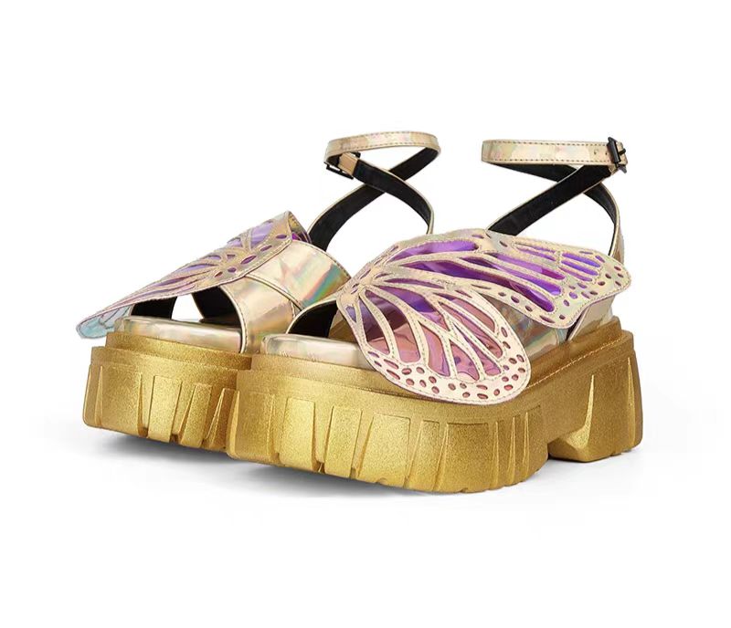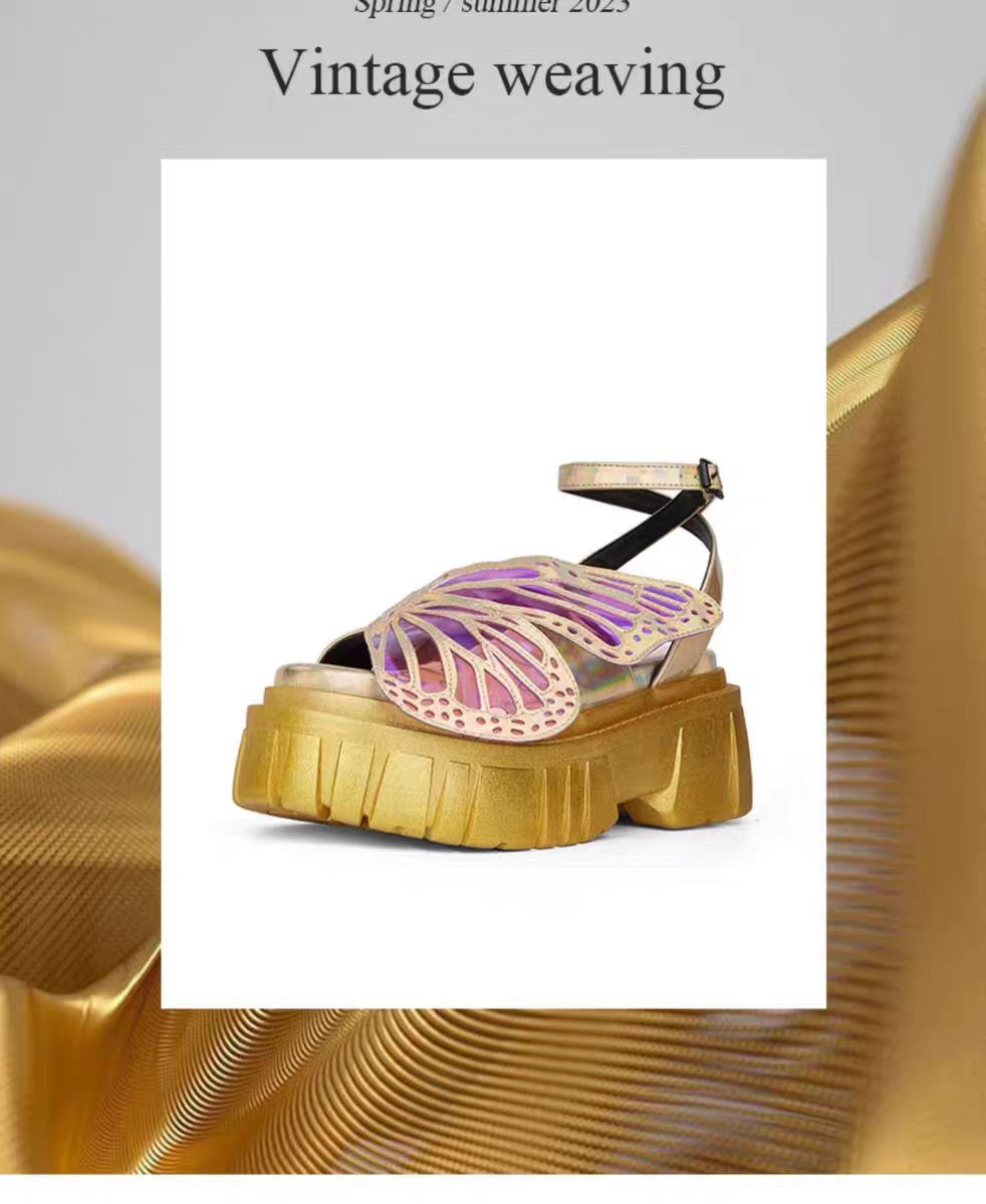 在时尚的舞台上,这双凉鞋宛如一颗璀璨新星。那栩栩如生的蝴蝶装饰,是梦幻与时尚的完美交融。幻彩材质打造的蝶翼,在光影下闪烁着迷人光泽,镂空细节恰似蝴蝶翅膀的脉络,精致入微,每一眼都是视觉盛宴。