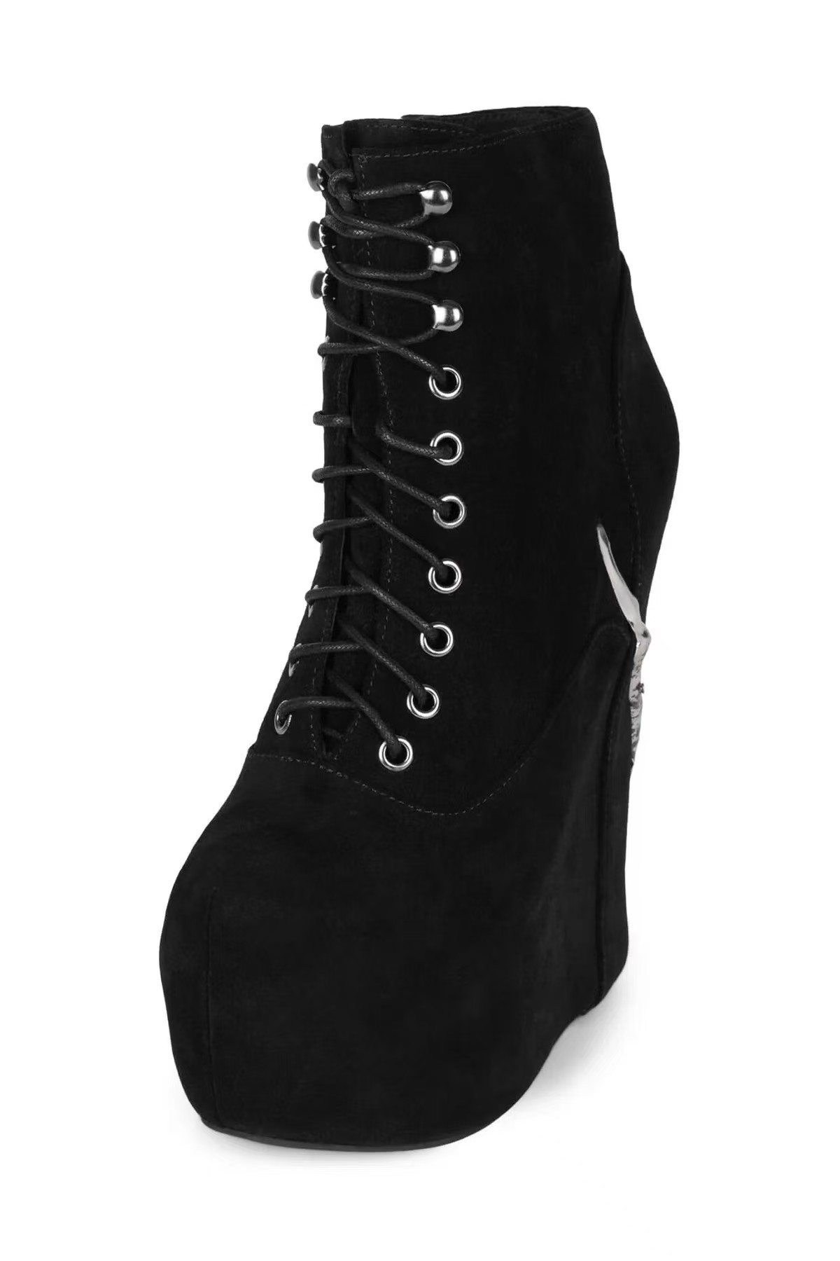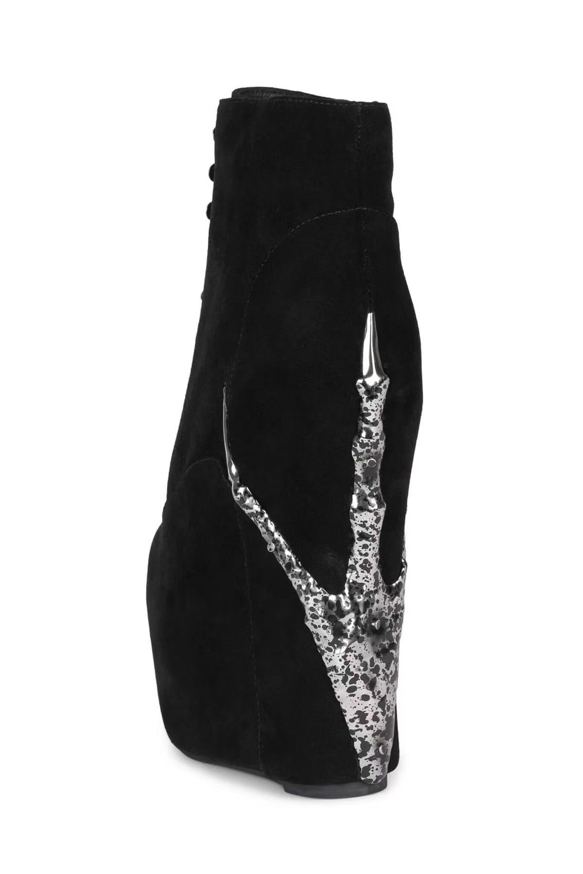 黑色磨砂靴身自带神秘气场,金属装饰如暗夜流星划过,那带着斑驳质感的银色,似古树盘结的枝桠,又像未来机械的残肢,野蛮生长在鞋跟一侧,打破单调,将暗黑与华丽、复古与先锋扭结在一起 。