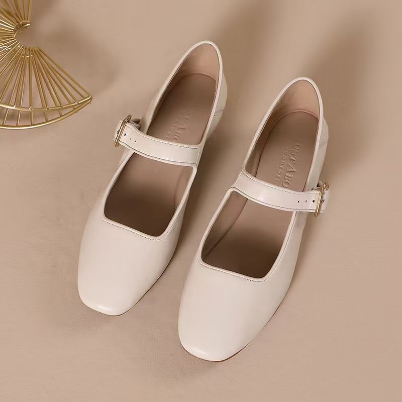 简洁的方头设计,似从复古画报中走出,带着旧时光的温婉。细腻的皮革如奶油般柔和,散发着低调的高级感,金属扣带则是画龙点睛之笔,为整体增添了一丝精致与俏皮。